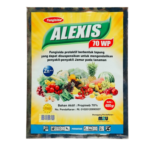 Alexis 70WP merupakan Fungisida protektif dengan bahan aktif Propineb 70% dan diperkaya dengan Zn++. Berbentuk tepung (WP) yang diformulasikan untuk melindungi tanaman dari penyakit jamur sekaligus memberikan nutrisi tambahan.