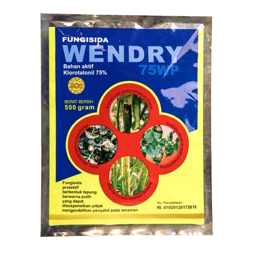 Wendry 75WP merupakan Fungisida protektif dengan bahan aktif Klorotalonil 75%. Berbentuk tepung (WP) yang bekerja sebagai perisai pelindung untuk mencegah infeksi penyakit jamur pada berbagai tanaman.