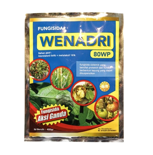 Wenadri 80WP merupakan Fungisida sistemik yang bersifat protektif dan kuratif dengan dua bahan aktif, Klorotalonil 64% dan Metalaksil 16%. Memberikan perlindungan ganda dari luar dan dalam untuk mengendalikan penyakit jamur.
